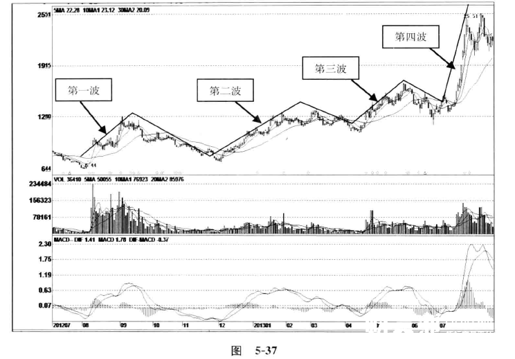 但是,需要提醒的是,在实盘中多波上涨的主升浪并不多见,而且股价多波上涨后,市场面临较大的回调风险,因此不作详细分析,也不提倡捕捉这样的主升浪,在此仅点到为止。