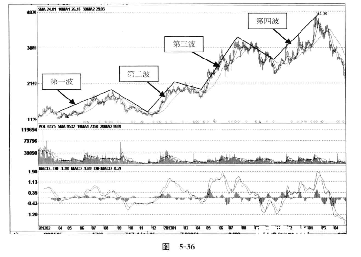 图5-36,国瓷材料(300285):该股上市不久就走出了四波主升浪,股价从12元左右开始逐波上涨﹐2014年2月18日股价突破了40元,整个上涨过程呈现四波小主升浪形态,每一波的涨幅都是很大的。