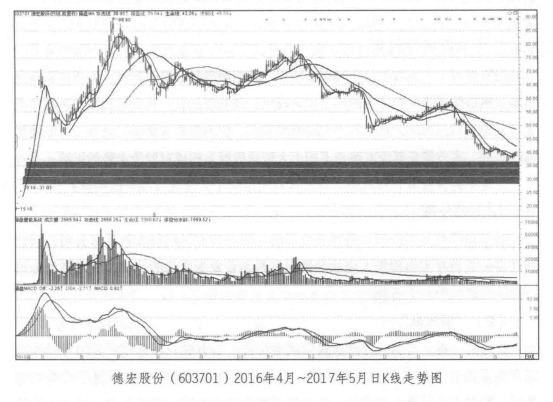 德宏股份是2016年上市的新股,到2017年5月总股本7840万股,流通股本3904万股,上市以来股价从19.16元上涨到89.9元,再次回落到39元。从德宏股份上市以来的数据看,虽然2016年出现明显的亏损,但是从2016年第四季度开始营业收入由递减变为上涨,在2017年第一季度出现了更为明显的上涨走势。然而,悲观的大盘环境和一再去杠杆的创业板让德宏股份的股价一再走低,曾经辉煌的次新股如今物是人非。