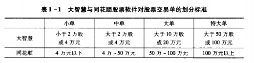 可见,在大智慧软件中对资金额和成交单股数提出了严格要求,而同花顺只是对资金额提出一个要求范围。在不同的股票软件中,资金量的名称不同,内容也存在一些差异。