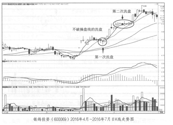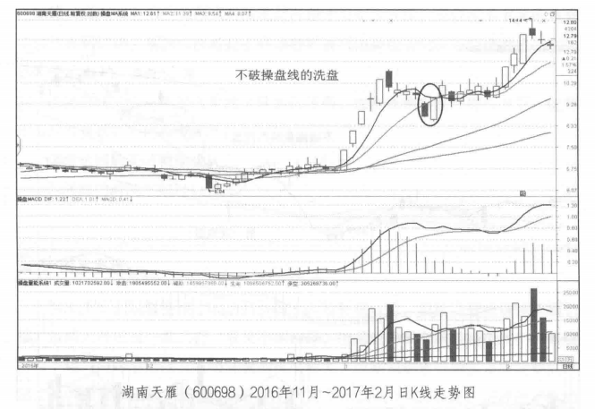 股价跌破操盘线时主力资金主动向上推升股价的概率会大大减小。操盘线对于散户的操作有着非常重要的心理支撑作用,也是普通投资者最常用的止损位,这为主力选择洗盘的目标位奠定了重要的基础。