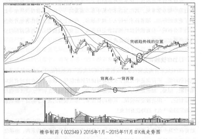 此时股价还在下跌趋势中,指标只是反映出了当下波段上涨或者下跌动能的状态,并不能反映趋势是否终结,只有在股价突破了原来的下降趋势线时,才能确定股价暂时进人了阶段性底部阶段,后期方向如何选择还待观察。