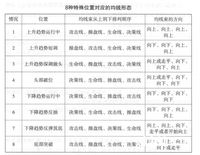 下表为趋势运行过程中8种特殊位置对应的均线形态,在股价的实际运行过程中,8种状态下的走势也是千差万别的,该表只针对该位置最具有代表性的均线形态,在后文会深度分析每种特殊位置出现的不同均线特征。