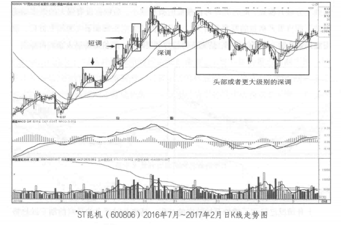 如图所示,"ST昆机 ( 600806)的上升趋势并不是非常强势,虽然不断创新高的K线带动了整个上升趋势的形成,可是几乎每根K线都有上下影线,说明在整个上升趋势行进的过程中有非常强的多空双方的分歧。