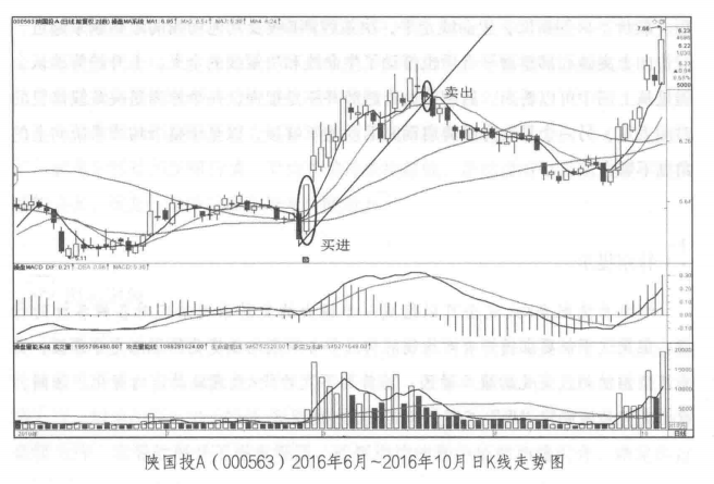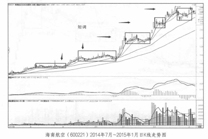 如图所示,海南航空(600221)的整个上升趋势运行的最大特点是上涨动能越来越强,前期还是小阳线为主,但是到了后期阳线的实体变得越来越大,均线的角度越来越大,均线之间的乖离也越来越大。