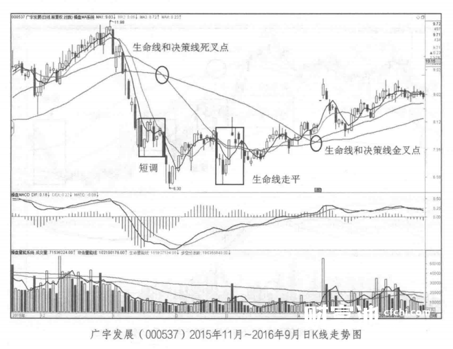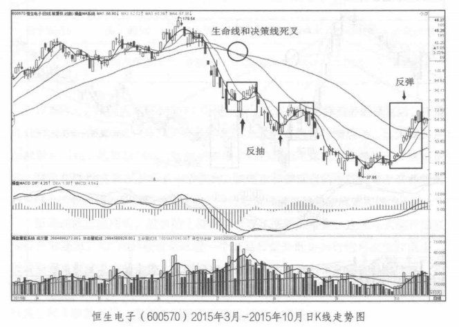 生命线和决策线一旦死叉,整个上升趋势就会彻底结束,只有等待新的蓄势期形成才会有新一轮的上升趋势。