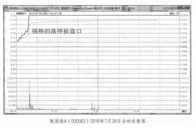 下图是涨停板启动上升趋势当天的盘口走势,开盘15分钟以缓慢爬升的形态上涨,股价回调不破均价线。当天涨停的一波上涨以接近90°角的方式进行拉升,持续的时间不足2分钟,如果不是一直盯盘很难有买入的机会,但是涨停板的一种操作策略就是确定当天股价足够强势时就要以涨停板的价格买进,即使没有立刻成交也要排队等候。