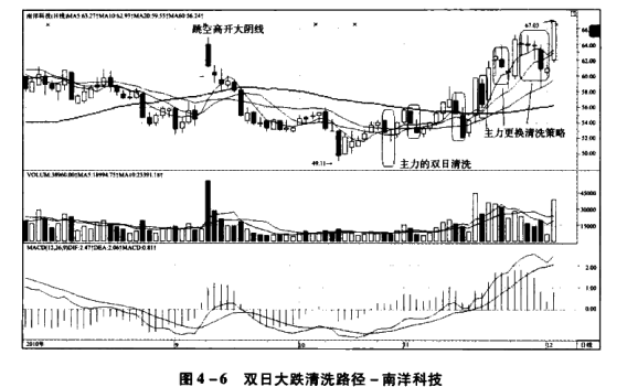 (2)双日清洗的跌幅较大,走势图形多见呈大阴线。