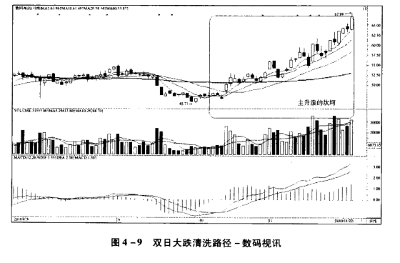 数码视讯﹑看图4-9,主力的清洗策略需要经常更换,小波段清洗时间过长,横盘清洗过于软弱,大跌式清洗在时间和力度上占尽优势,这些都是主力常用之技。许多时候主力的清洗,是由于大盘的原因而做出。判断这些需要从大盘、股价走势、成交量、资金量等多方面考虑。