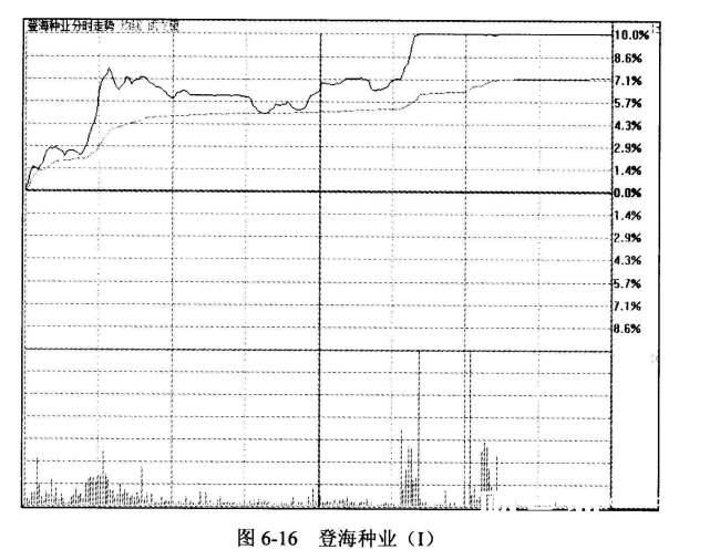 图6-16是登海种业在2015年3月25日的分时走势。股价在拉升的过程中出现了明显的两波拉升。拉升的回调阶段可作为投资的买点。
