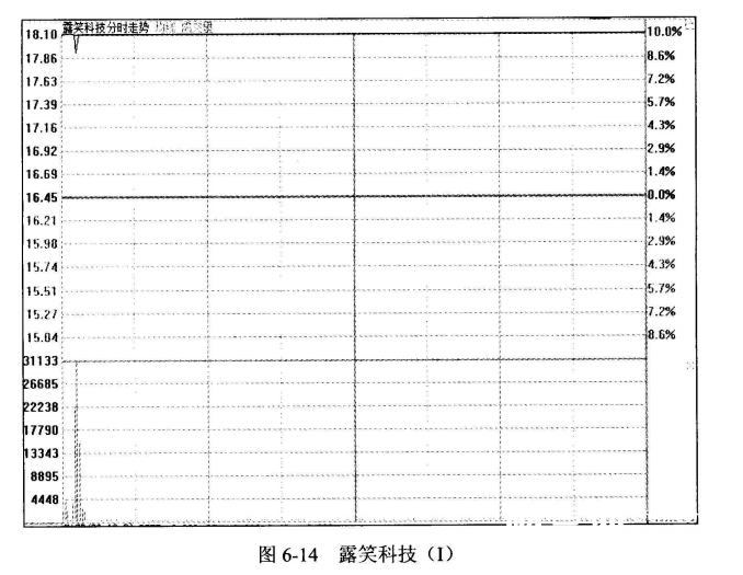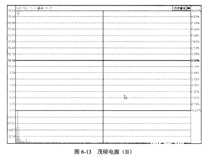 我们看当时的分时图。图6-13即茂硕电源在图6-12中“T”形板的分时走势。股价以涨停板开盘,随后股价短暂开板洗盘,让意志不坚的投资者抛出筹码,随后迅速封板,股价随后的走势也步入上升通道。