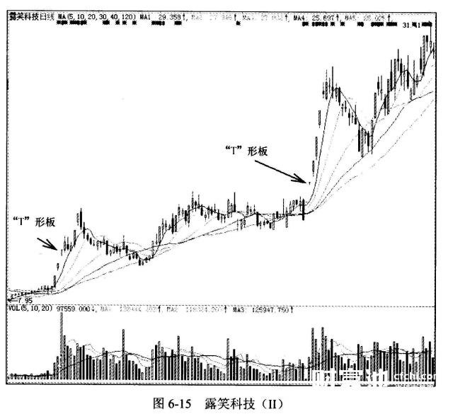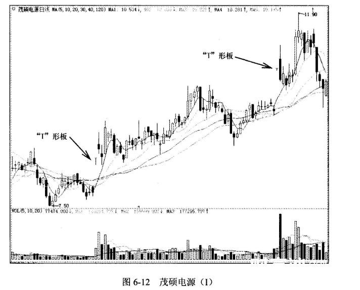 对比两个案例,我们也能看出其中一些相同与不同的走势。股价都出现了“T”形板。出现“T”形板后股价也都有了不同程度的升幅。对比它们的升幅我们又能发现一些不同。图6-15案例的升幅明显是要大于图6-14案例的。