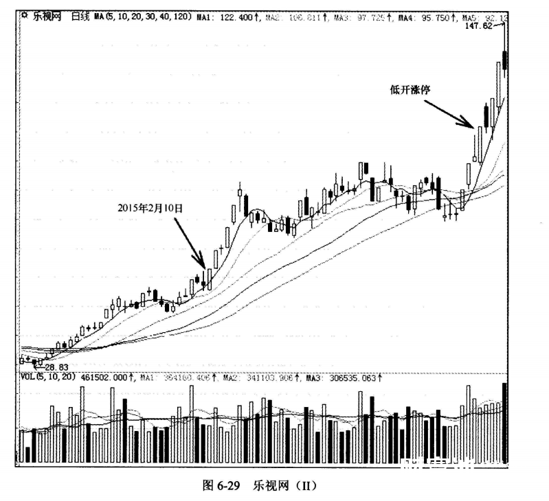 我们再看当时股价的K线走势,低开涨停的意义也就一目了然了。图 6-29是乐视网在2014年12月~2015年4月的K线走势图。图中出现了多个低开涨停。我们说低开涨停是主力迷惑散户的行为。那么是什么可以使散户被迷惑呢﹖