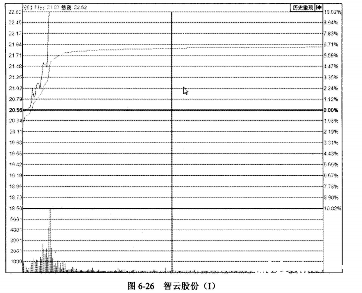 图6-26是智云股份在2015年3月9日的分时走势图。从图中我们看到,股价低开随后一波拉升封至涨停的“一步到位”走势。低开涨停走势的内涵都在低开二字上。