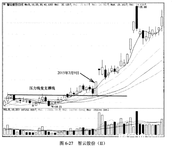 我们看当时的K线形态。图6-27是智云股份在2015年1月~2015年4月的K线走势图。图中的涨停正是股价突破压力线并回调确认后的再次拉升。此次涨停拉升后股价快速上涨,短时间内从20元走高到35元以上。及时介入的投资者获利不菲。