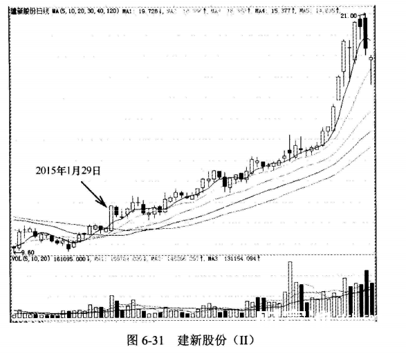 我们看当时的K线走势。图6-31是建新股份在2015年1月~2015年4月的K线走势图。在出现一个低开涨停后,股价打开上升空间,自10元左右走到高点时的21元上下,短短两三个月获利翻倍。投资者遇上此种走势的个股可积极关注。
