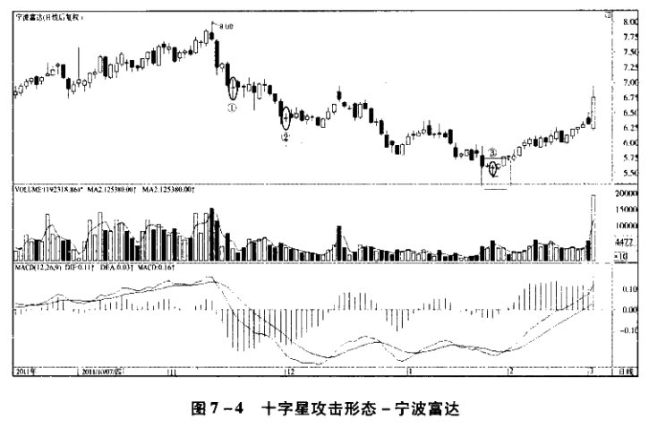 宁波富达在2010 年11 月17日和2010 年 12月1 日,图中①处和②处是两个比较典型的十字星形态。这两个十字星形态出现在股价的盘整期,此后仍有多个十字星形态的出现,其中有几根阳线的出现,但是没有出现翻转,主要原因是主力在持续减仓,后续没有资金的连续流入。