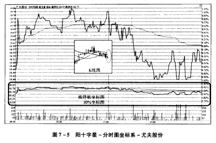 在看十字星攻击形态时要注意分时坐标系。在多数的股票软件中,分时坐标系是自动的,随着股价的波动变化,软件系统自动调节分时坐–标系。有时我们看到的分时图波动曲折非常大,其实在涨停板坐标系下看股价的曲折明显变得缓和多了(如图7-5)。