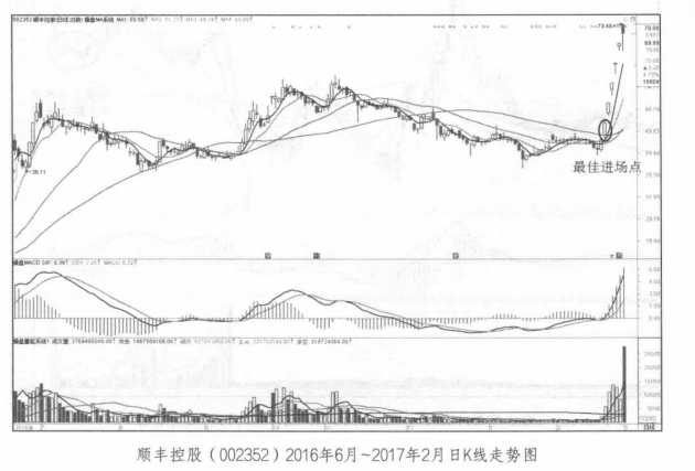 下图中有标注“最佳进场点”,这就是操作顺丰控股最好的位置。但是有的投资者会质疑:因为它后市涨得那么强,所以才敢说那根大阳线是最好的进场