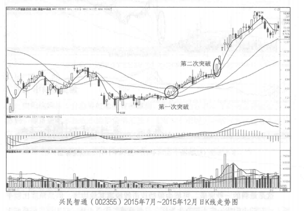 这是最弱的一种突破,可能会带动攻击线脱离其他均线,但是角度比较平缓,此时的小阳线一定不能有上影线,且最好第二天再出现一根阳线,如果两天或者三天连续阳线的整体涨幅达到7%且伴随放量,则还是可以确认上升趋势形成的,但是这种上升趋势的运行过程基本是以小阳线和中阳线为主,很难出现大阳线。