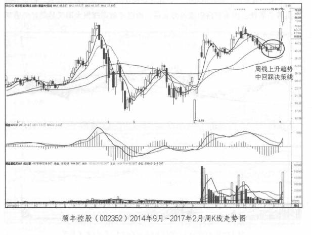 上图中日线上的均线走势可能会让投资者纠结,那么看下图对应的时间上顺丰控股在周线上的走势:决策线维持大角度上升趋势,短期均线走坏后回踩决策线。