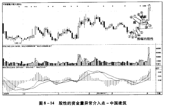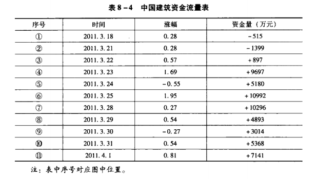 中国建筑惇看图8-14中④和⑤处,④处资金流入9697万元,股价涨幅1.69%,图中⑤处资金流入5180万元,股价跌幅0.55%。