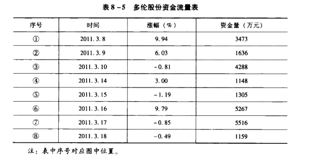 多伦股份看图8-15多伦股份和表8-5多伦股份资金流量表,图中①处,股价出现大涨,资金流入3473万元。图中③处,资金流入4288万元,但是股价走势却出现明显的滞涨,涨幅为–0.81%。图中④处,资金流入1148万元,股价涨幅3.00% ,图中⑤处,资金流入1305万元,股价涨幅-1.19%。