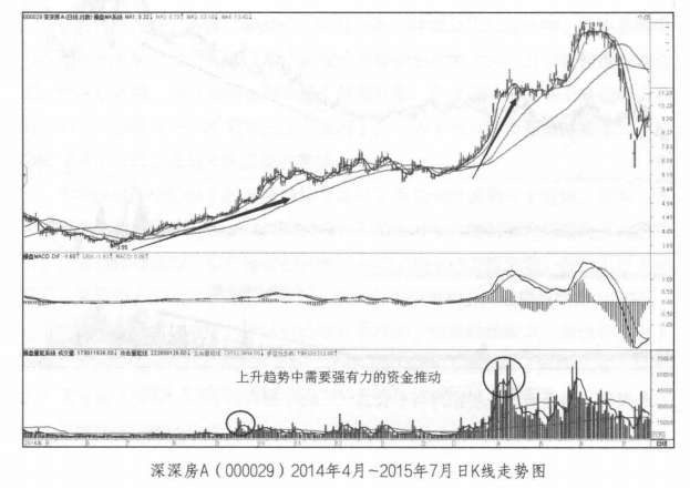 如图所示,从深深房A ( 000029)的整个上升趋势中可以看出,每个波段的上涨必然有量能放大的过程,而且上涨角度越大的波段释放出来的量能越大。