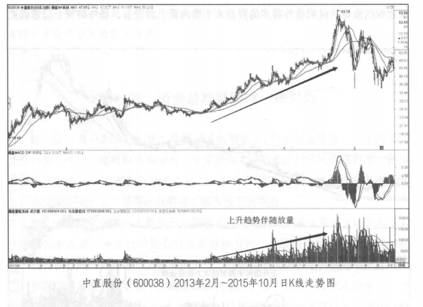下图的中直股份(600038)的走势也说明,不管是强势的上涨还是缓慢的通道式上涨,上升趋势的运行必须伴随放量。虽然中直股份的上升趋势不是非常流畅,但是在整个上涨过程中量能也呈现出了逐渐上升的趋势。笔者在不看K线和任何指标只看成交量的情况下就可以进行交易的原理就在于此。