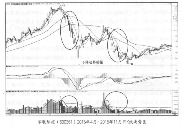 华联综超(600361)的下降趋势也是对下降趋势缩量的一个验证,在第一波快速杀跌的初期量能有初步放大的过程,后期就属于典型的场内筹码抱有幻想式惜售,量能持续萎缩,股价持续创新低。在做了简单的头部之后,股价走出了明显的下降趋势。所以在下降趋势中对于量价的分析要和上升趋势有明显的区别。