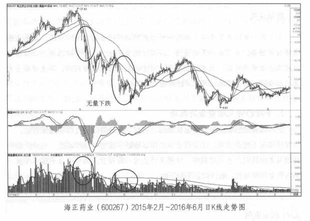 如图所示,海正药业( 600267)的每一波下跌都是比较勐烈的,但是从图中可以清晰地看到,在下跌速度最快的过程中量能是在缩小的。有的时候投资者会被这种现象麻痹,因为始终觉得无量下跌是好事,但是这种情况在上升过程中是适用的,当趋势转为下跌后就完全不适用了,因为下跌不需要量能的推动,一旦趋势形成了反转,无量下跌是没有底的。