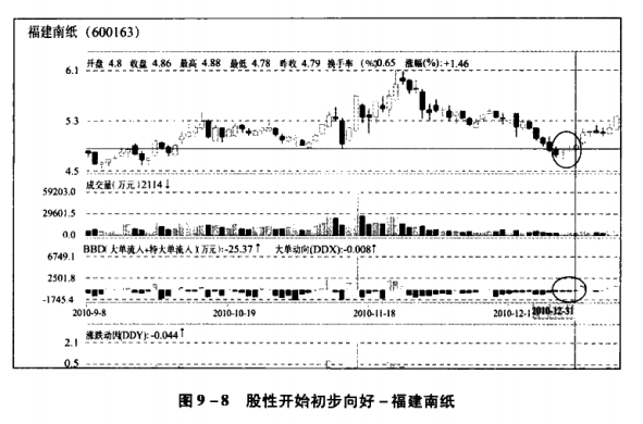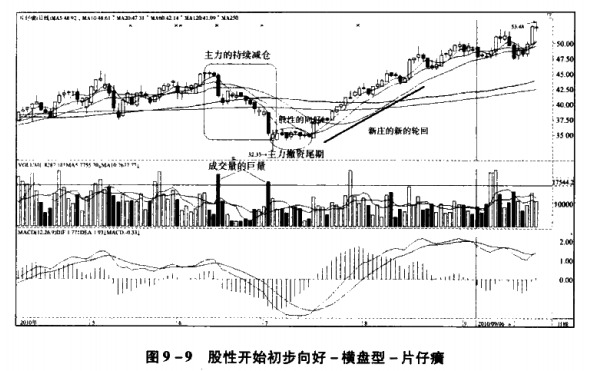 片仔癀图9-9是在前庄主力撤资尾期,股性向好股价出现了上涨,就涨幅而言势头良好。该股股性向好隐藏在股价走势出现多日横盘期间,就横盘走势而言比较隐蔽,令人难以察觉。