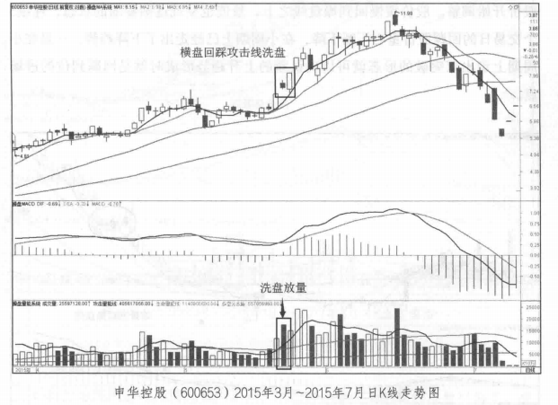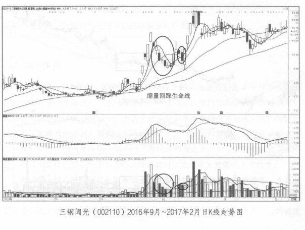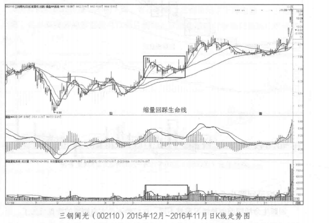 回踩生命线同前两种情况截然不同,这已经不是主力短暂的洗盘行为了,而是展开了调整,持续的时间相对较长,下跌的空间也较大。股价在完成一波上涨之后遇到的不是市场内大资金刻意而为的快速打压洗盘的行为,而是市场内在结构本身需要对股价进行的调整。