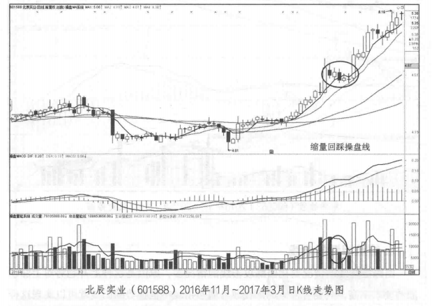 在回踩操盘线的过程中一定要缩量,但是开始调整的初期可以放量,在回踩的末期必须缩量。回踩操盘线也是一种洗盘行为,量能从放量到缩量的过程中是为了检验市场上的浮动筹码已经清洗干净,后期才有再次稳健上涨的可能。