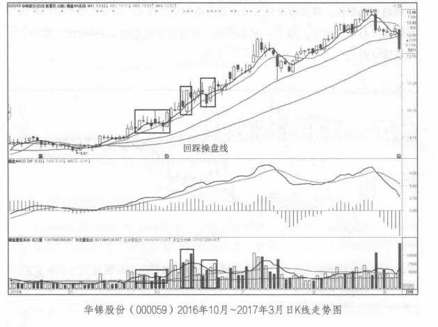 回踩操盘线的情况要比回踩攻击线的情况多,原因是这种上升趋势对上涨动能的要求不高,只要有连续的阳线或者偶然出现一根强势的阳线就可以实现这样的上涨行情,所以缩量回踩操盘线比较常见,对于投资者来说是非常具有实战价值的交易模型。