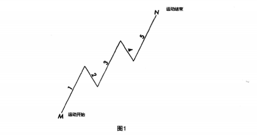 一个维度上的五个浪会成为下一个更大维度或浪级的第1浪。比如说,在图1中从点M行进到N的五个浪,图2表示的运动与图1的相比是更大级别的浪型运动。
