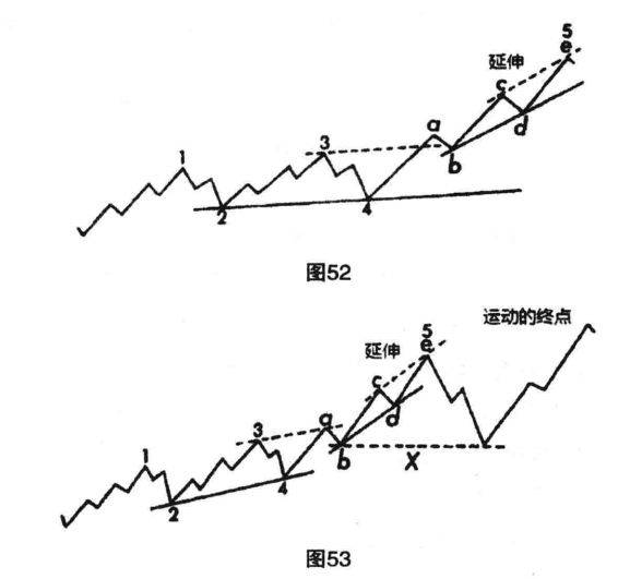 通过绘制通道的方法对于我们在测量延伸浪的运行长度时非常有用。因此、在图52和图53中,直线“b~d”代表基线,上通道线“c ~e”是对延伸浪“第一顶部”的理论预期。