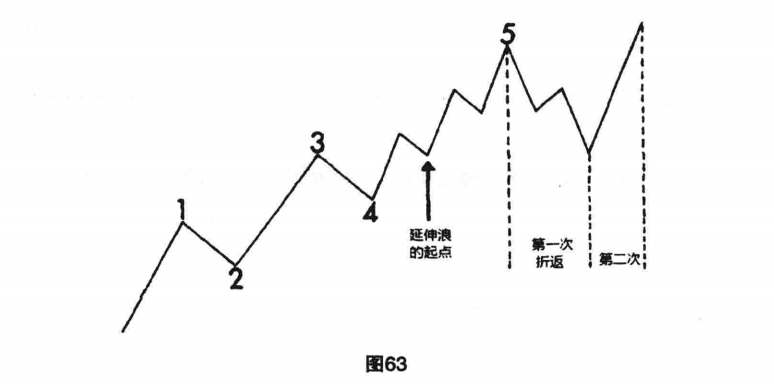 只有在第5浪之后,第一次回撤才会回到延伸浪第2浪的最低点。)。如果延伸浪出现在第3浪,那么双重回撤会受到第4浪和第5浪的调整。图63向我们展示了第5浪中的延伸浪以及后续的双重回撤现象。
