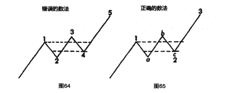 非常重要的是,我们应该注意第3浪永远不会比第1浪和第5浪都短。例如,当浪3像图64所示那样比浪1和浪5都短时,就表明我们数浪的方法错了(如果数浪正确的话,第3浪不可能是最短的波浪),正确的数法应该如图65所示。
