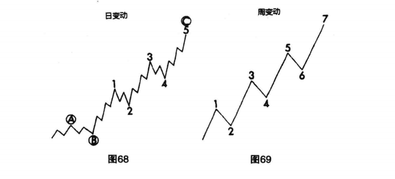 请注意,在周线变动中,第一上升浪的构成子浪并没有准确地反映出来,学习者可能会错误地认为在日线变动中第1浪会由5个浪组成。根据周线变动曲线,一个倒置的平台形可能看上去由7个浪组成,但它是一个倒置的平台形,即A、B、(1、2、3、4、5)C,如图68所示。