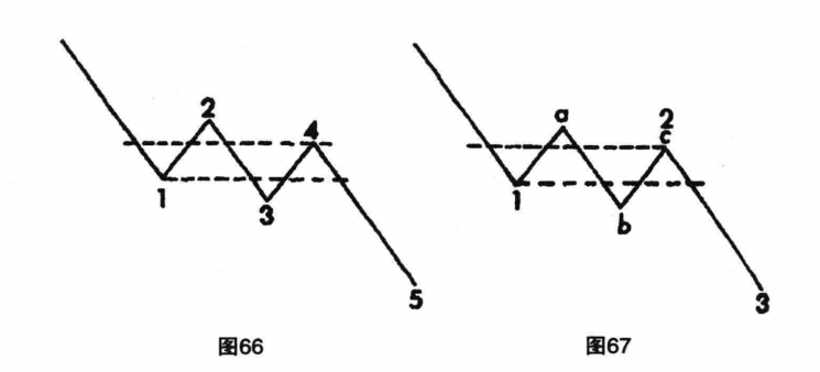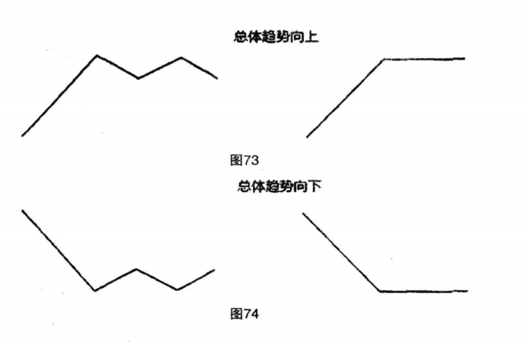 图73向我们展示了上升运动后的两种横向运动。而在图74中,股价的主要波动趋势是向下的。