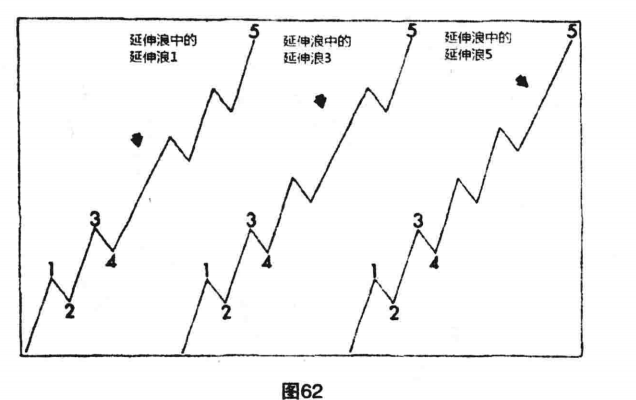 延伸浪只会出现在当前循环的新区域,也就是说,它们不会作为调整浪出现。延伸浪中还会出现另外一种复杂形态:延伸浪中的延伸浪(见图62)。
