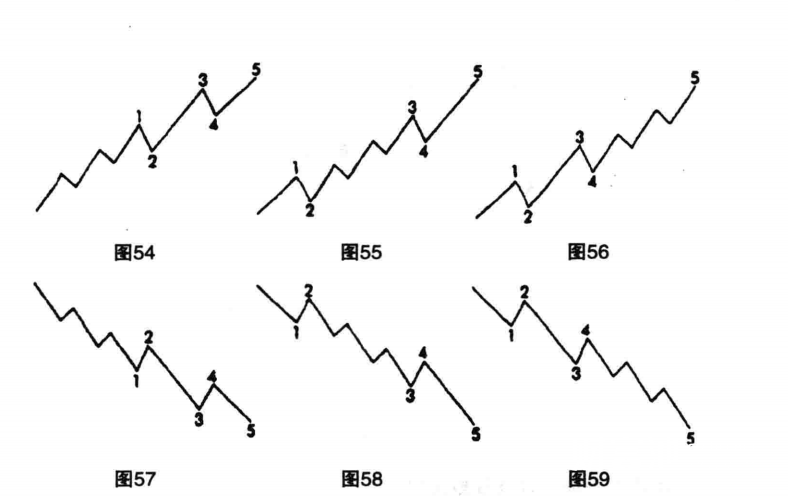 延伸浪可以出现在任何三个驱动浪之中。例如,浪1、浪3和浪5,但是从来不会超过1个,如图54、图55和图56所示(向上)以及图57、图58和图59倒置的、向下)所示。
