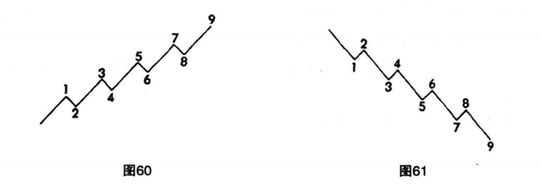 我们可以注意到,在上面的每个例子中,无论是何种延伸浪形态,总共都是有9个浪,我们应该将延伸浪数成5个浪,而非当做一个浪来算。在极少数的情况下,一个延伸运动将由9个相同规模的浪组成,如图60和图61所示。