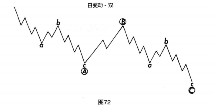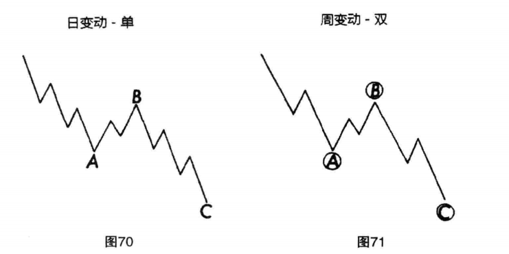 相同的情况还可能会在锯齿形调整浪中出现。锯齿形调整浪不会变长,但可以说它会变大或是出现对折,如图70和图71所示。无论锯齿形调整浪是单个的还是双重的、其调整特征都是一样的。