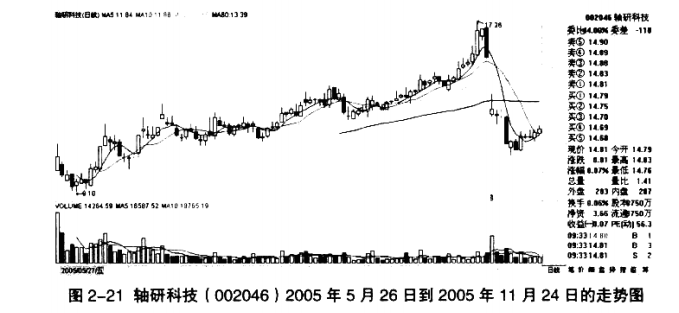 图2-21为轴研科技( 002046)在2005年5月26日到2005年11月24日的走势图。该股是在2005年5月26日上市的,总股本为6500万股,流通盘.2500万股,首次上巿流通为2000万股。