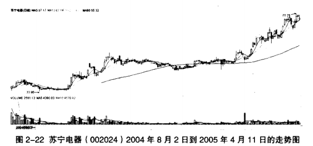 图2-22为苏宁电器( 002024)在2004年8月2日到2005年4月11日的走势图。苏宁电器于2004年7月21日,登陆深圳交易所的中小企业板,上市后股价连续上涨了3天,同时引领中小企业板块的所有股票全面上涨。此次苏宁电器共发行2500万股股票,筹集资金4亿元,主要用于11家门店的建设,同时保持增加苏宁电器在一级市场的市场份额.从而加速市场的扩张。