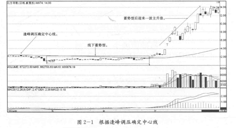 选取最邻近谷底点的峰顶点,用逢峰调压技术确定中心线。如北方导航(600435),见图2—1。