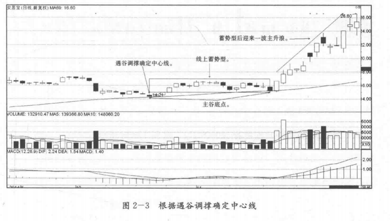 又如安居宝(300155),见图2―3,价格在中心线上方小阴小阳窄幅横盘波动,主力控盘特征明显,不温不火地收集够筹码,边洗边拉,把一些不坚定的持股者震仓出局,在国安委成立的消息公布后,主力加快了拉抬股价的步伐,以一根倍量柱涨停板的形式启动主升浪,可谓众人拾柴火焰高,洗去浮筹后的股价就如脱缰的野马连续狂奔。