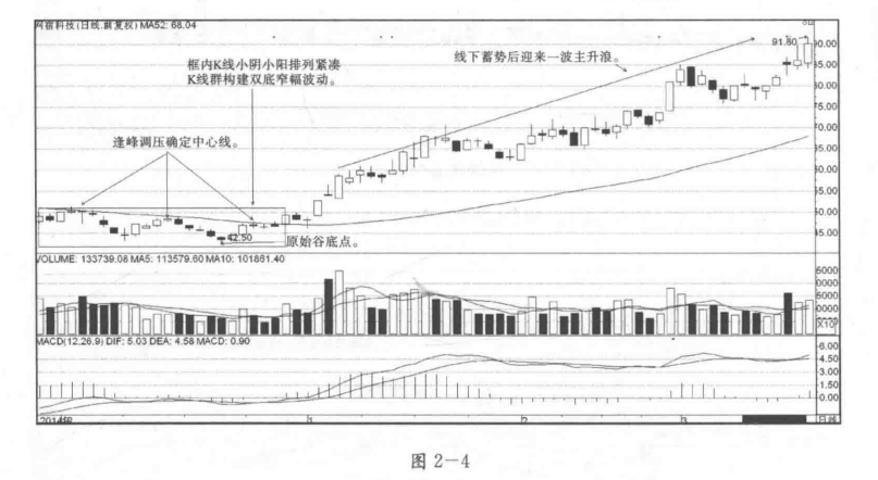 如网宿科技(300017),见图2—4,主力先在线下以蓄势型的形态收集筹码,构建了坚实的双底底部。在中心线52日均线被放量突破后,主力加大了拉抬股价的力度,技术特征表现涨放量跌缩量,价格屡创新高,昔日龙头风范再现,消息面上,该股集几种题材于一身如电信运营、电商、信息安全等等,给主力足够的信心与决心做多该股。